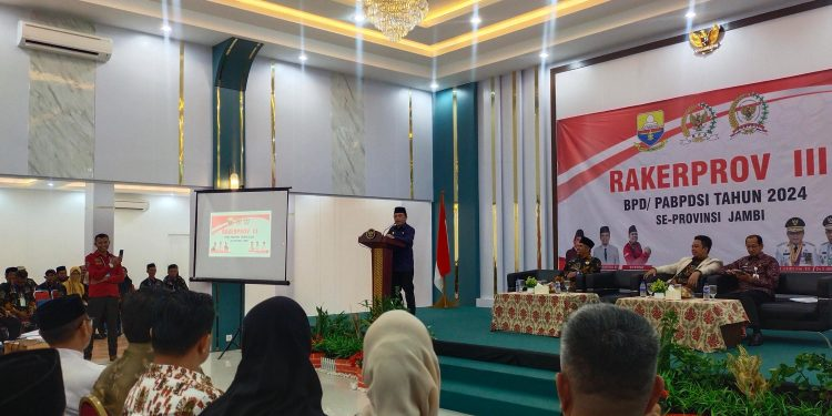 Jambi – Gubernur Jambi Al Haris membuka secara resmi rapat kerja provinsi (Rakerprov) III Persatuan Anggota Badan Permusyawaratan Desa Seluruh Indonesia (PABPDSI) se-Provinsi Jambi, di BallRoom Ratu Duo, Ceria Hotel, Kamis, 5 September 2024.