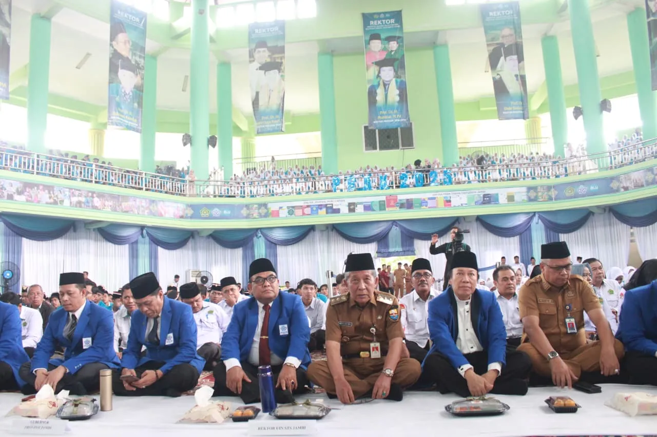 Mendalo – Wakil Gubernur (Wagub) Jambi Drs. H. Abdullah Sani, M.Pd.I sangat mengapresiasi kegiatan Pengenalan Kehidupan Kampus Mahasiswa Baru (PKKMB), semoga kegiatan positif ini dapat menambah kualitas mahasiswa dalam melanjutkan masa depan yang lebih cerah, apalagi ke 4 isi rekor Muri yang diraih diimplikasikan dalam kehidupan sehari-hari, insya Allah akan menjadi lebih baik kedepannya generasi bangsa. Hal tersebut disampaikan Wagub usai mengikuti penutupan Pengenalan Kehidupan Kampus Mahasiwa Baru (PKKMB) sekaligus Pemecahan 4 Rekor Muri Tahun 2025 Universitas Jambi, bertempat di Lapangan Serba Guna depan Gedung Balairung Universitas Jambi, Mendalo, Kabupaten Muaro Jambi, Senin, 25 Agustus 2025 pagi.