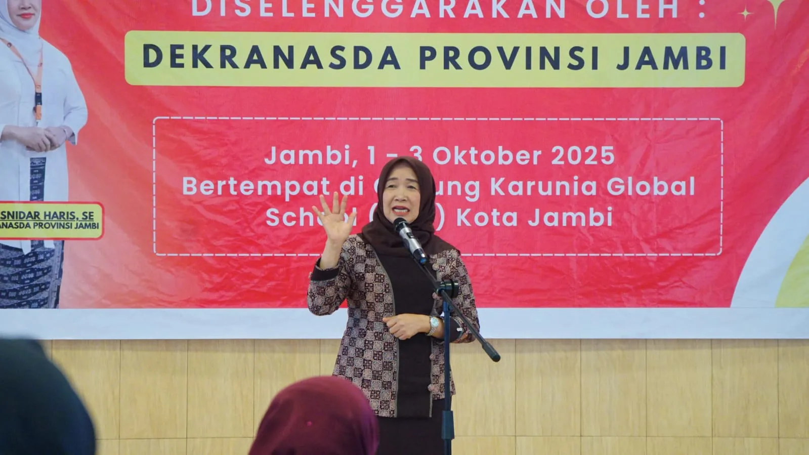 Jambi – Ketua Dewan Kerajinan Nasional Daerah (Dekranasda) Provinsi Jambi, Hesnidar Haris (Hesti Haris) menghadiri sekaligus membuka Pelatihan Desain Fesyen yang diselenggarakan oleh Dekranasda Provinsi Jambi di Gedung Karunia Global School, Kota Jambi, Rabu pagi, 1 Oktober 2025.